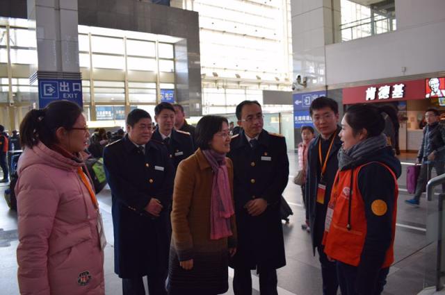 1月21日,久久久久国产成人精品亚洲综合党委副书记刘淑慧、学生处处长任晓杰、副处长严军、理学院党总支副书记宋珺一行四人来到上海火车站慰问志愿服务春运的“橙员”们,在上海站纪委书记李博、团委书记陈浩的陪同下到各个志愿者工作岗位,与志愿者们亲切交谈,关心志愿者们身体状况和春节回家买票等情况。在与志愿者交流过程中,刘书记赞扬了志愿者们可贵的志愿服务精神:“能在忙碌的学期学习结束后,舍弃寒假的休息时间,走进社会、服务社会、这不仅是青年学生责任与担当的表现,更是成长过程中提炼品格的极好机会。”