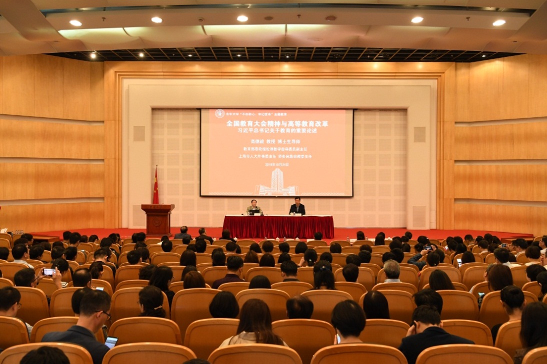 本次集中学习研讨分专题学习报告与分组研讨两部分。在上午的专题学习报告会暨党委理论学习中心组(扩大)学习会上,教育部思政理论课教学指导委员会副主任,上海市人大华侨民族宗教委主任、外事委主任高德毅作题为“全国教育大会精神与高等教育改革”的报告,以“九个坚持”为纲并结合上海高等教育改革的思考与实践,对习近平总书记关于教育的重要论述进行了深入阐述,帮助广大党员干部更好学深悟透,把思想和行动进一步统一到贯彻落实立德树人根本任务上来。