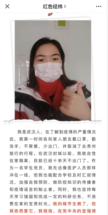 在学院党委的号召下,纺织学院各学生支部通过线上“云”组织生活的方式,借助学习强国平台,以交流讨论、视频会议等形式召开了一场主题为“一心‘移疫’,筑起战‘疫’青春防线”的组织生活会。各学生支部组织党员认真学习领会党中央疫情防控指示精神和学校防控工作要求,纷纷表达了要一切行动听指挥,做好科学防控知识的传播者,认清在疫情防控工作中肩负的责任和使命。其中,学生党员赵泽阳在参与后说道“在这次疫情中,我深刻感受到了万众一心齐心抗疫的中国精神,我作为一名中国人感到骄傲;而作为一名纺织人,疫情防控工作中的纺织力量也让我更加坚信了我的专业选择。”与此同时,学院通过红色经纬微信公众平台,先后推出了由学院党员师生带头主动发声的“十句箴言牢记心”的倡议书,“战‘疫’纺院党员说”“战‘疫’纺织人战疫故事”等专题系列宣传帖,在网络上倡导人人守责、人人担责、人人尽责,为打赢这场战役树立信心和勇气。